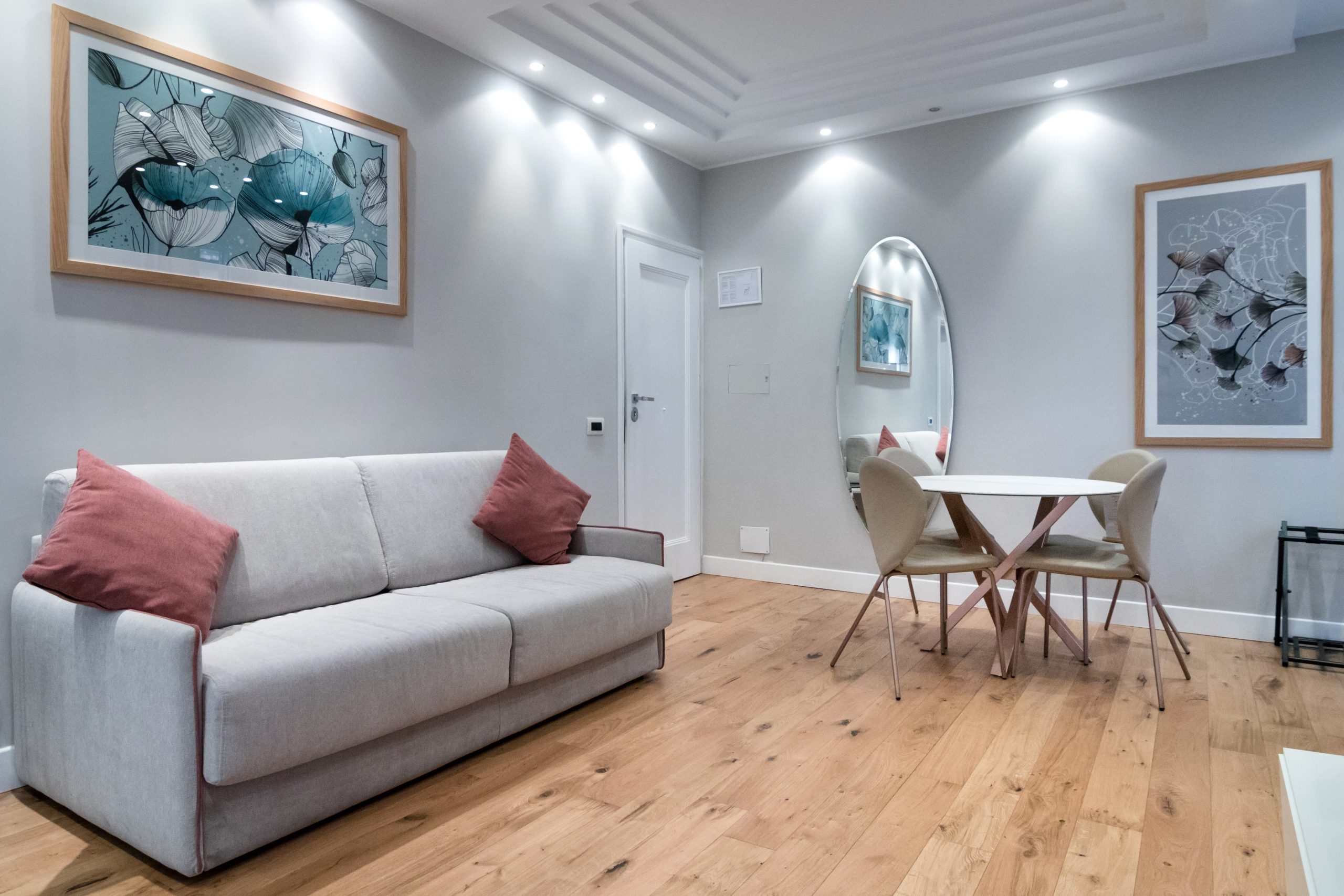 La Suite è un appartamento su 2 piani caratterizzato da un elegante ed ampio soggiorno, dove una scala conduce alla camera da letto e al bagno con soffitto a travi.