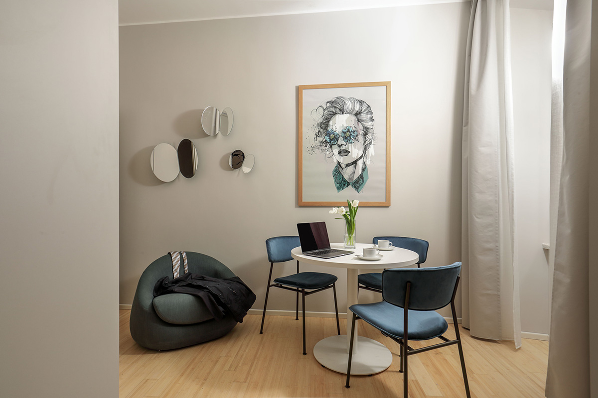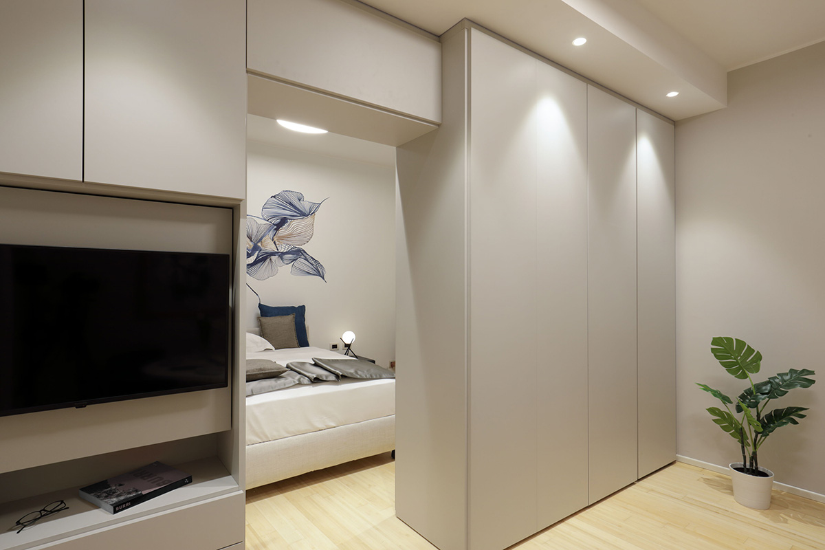 Questa Suite con affaccio su via di Gesù e Maria è caratterizzata da un unico ambiente suddiviso da un elegante arredo interno che divide la zona notte dalla zona giorno ed un elegante bagno con doccia.